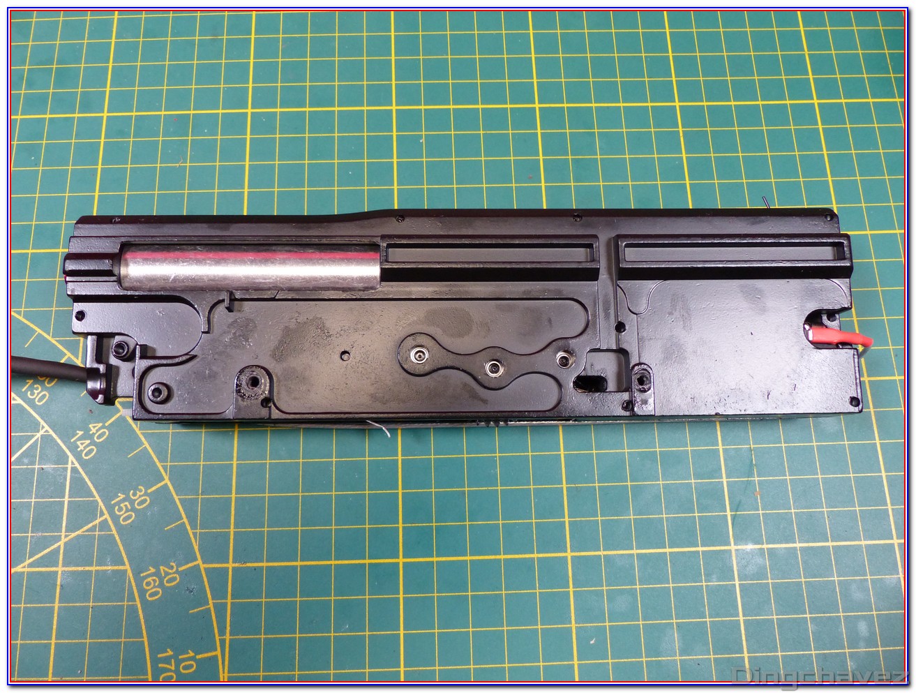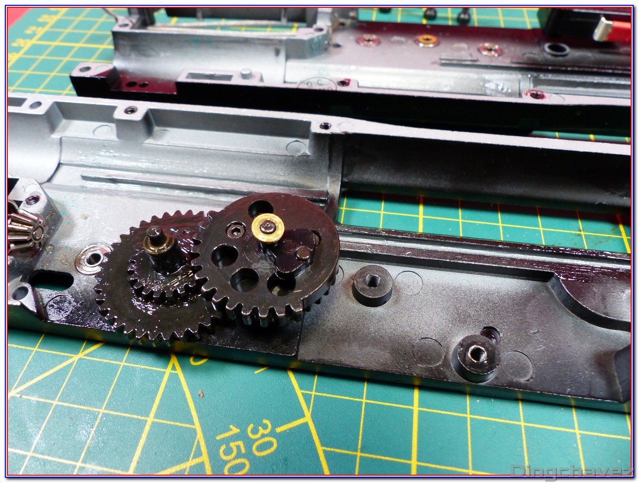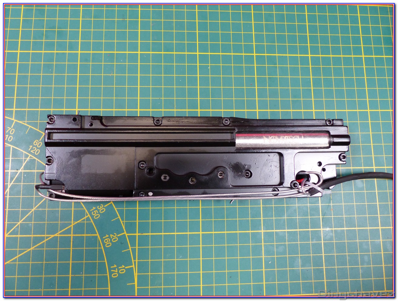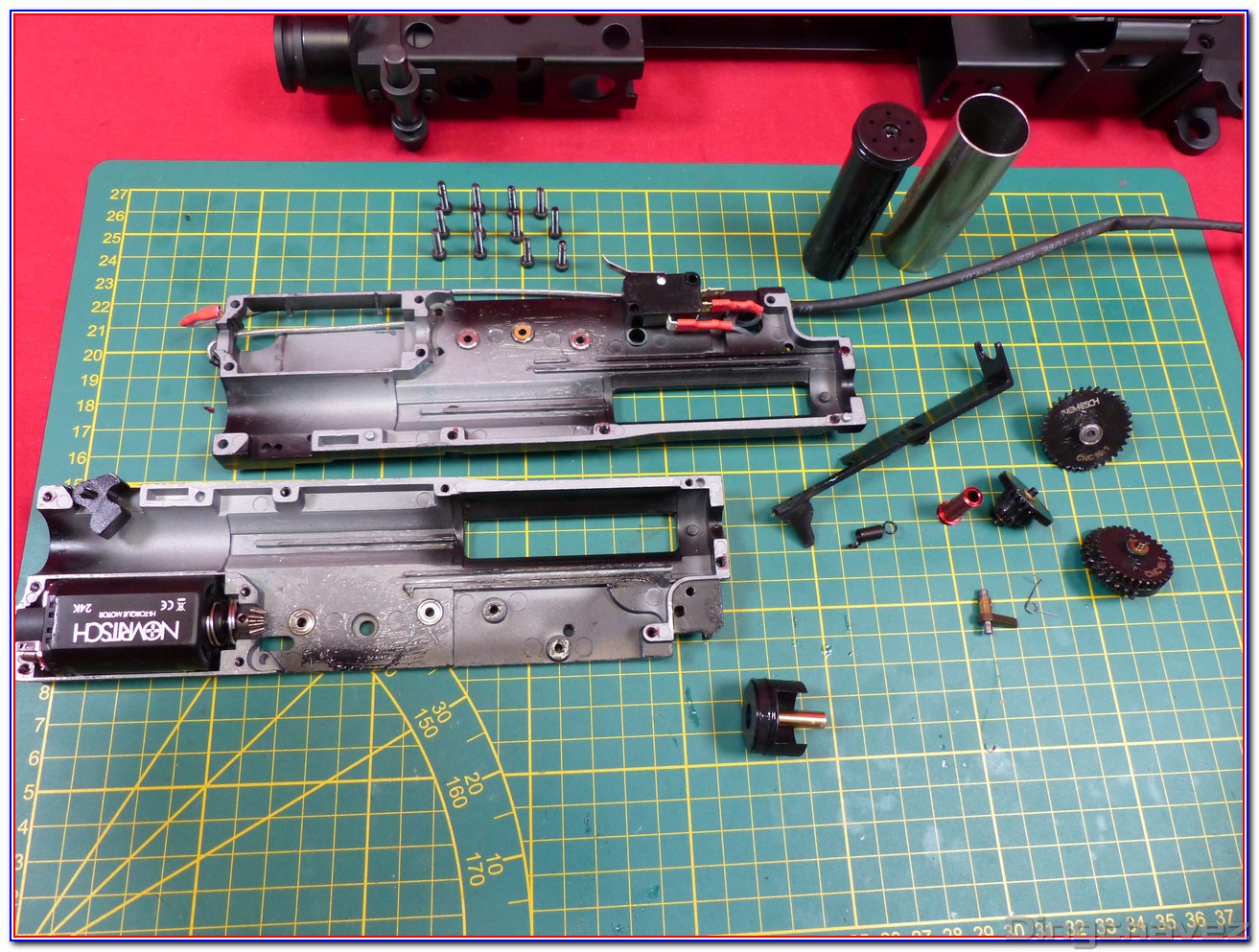 Cela découvre la grosse gearbox et donne accès au bloc hop-up et sa molette d’ajustement.