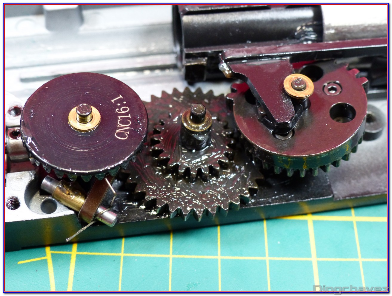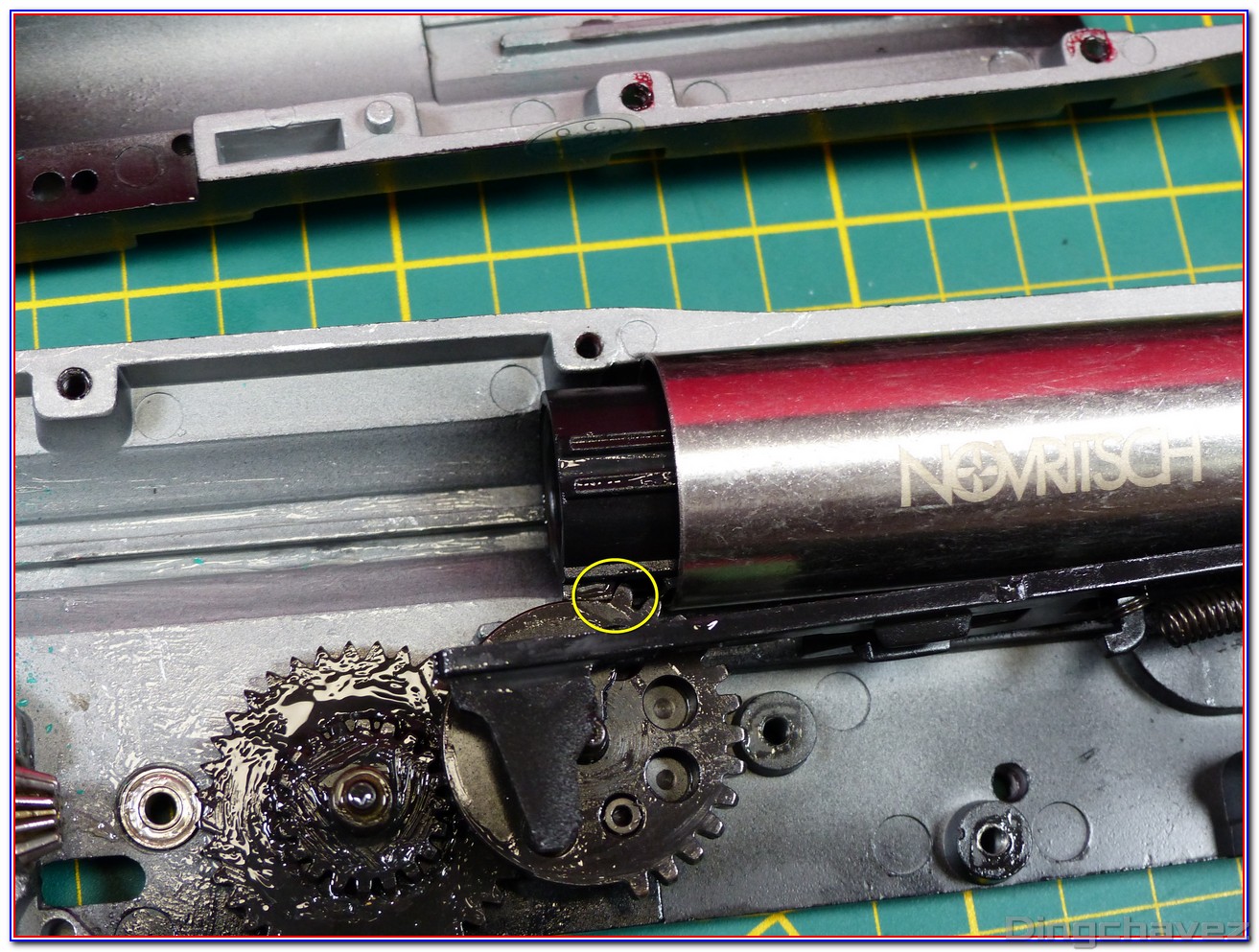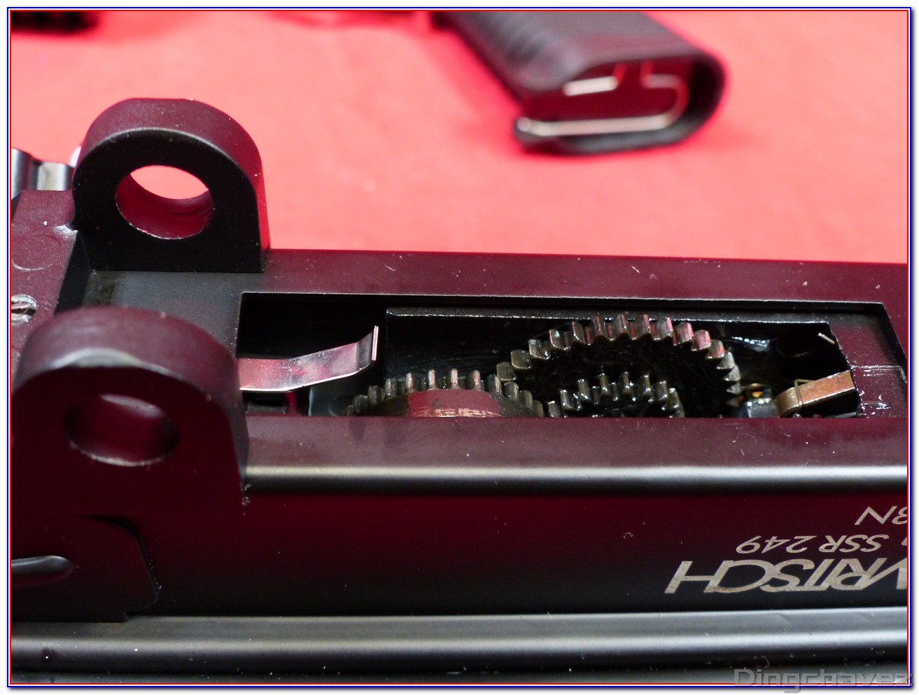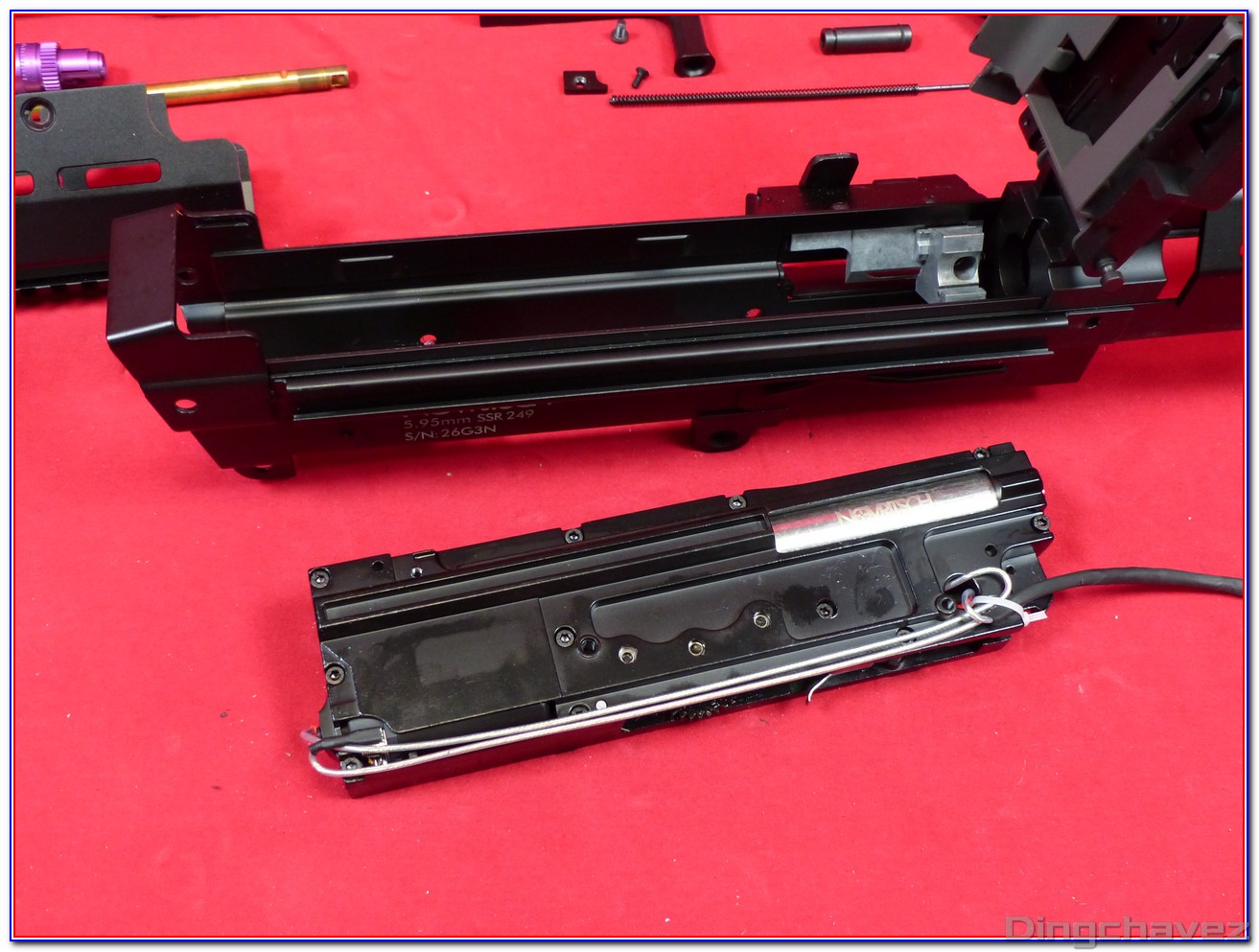Cela découvre la grosse gearbox et donne accès au bloc hop-up et sa molette d’ajustement.