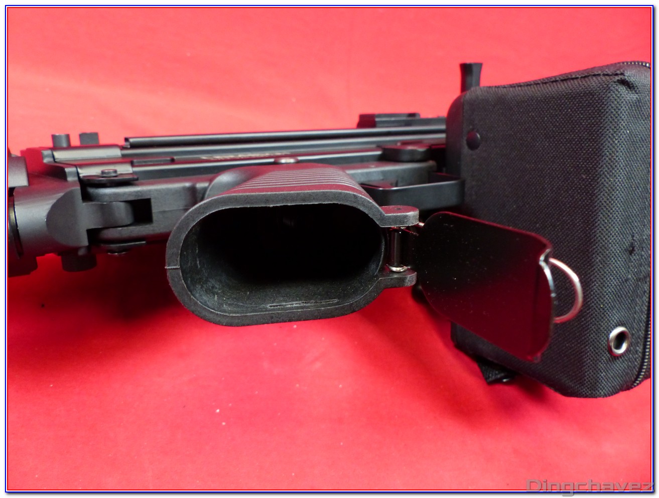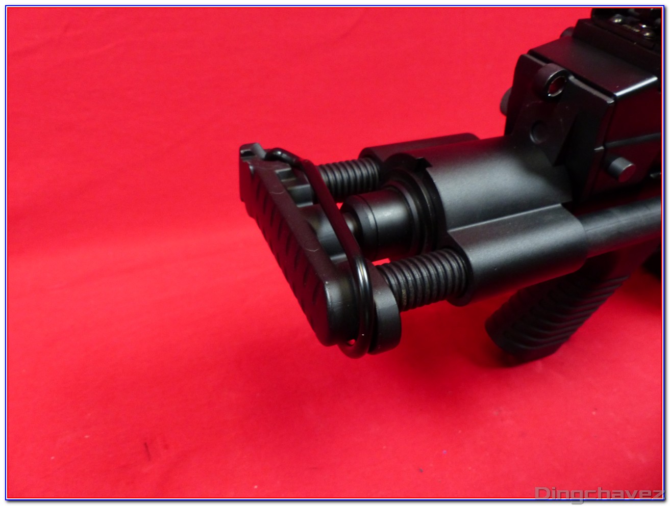 Une extension se déplie pour faciliter l’épaulement de la réplique. Cela constitue un point d’appui bienvenu pour stabiliser son tir.