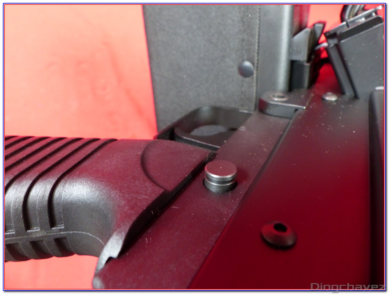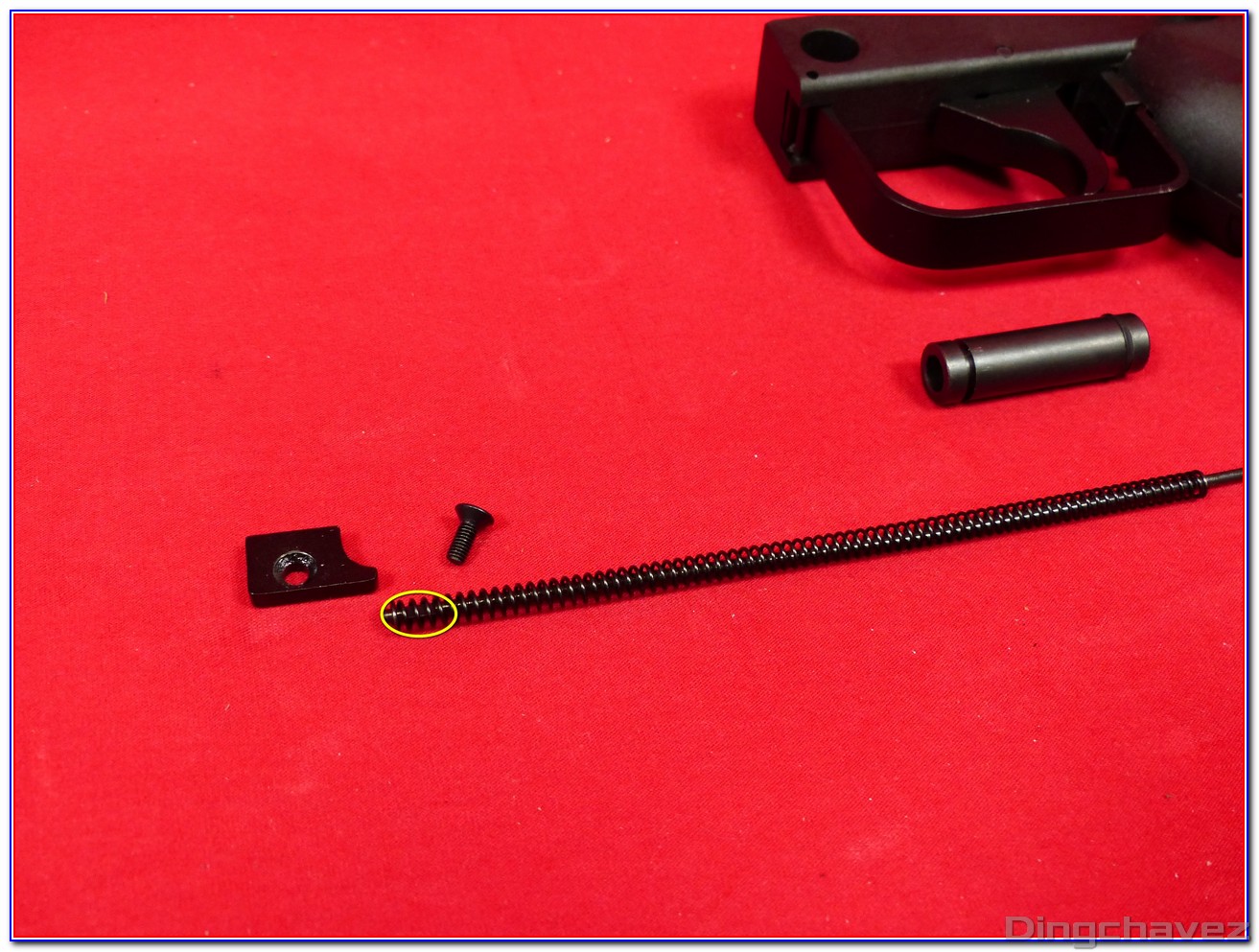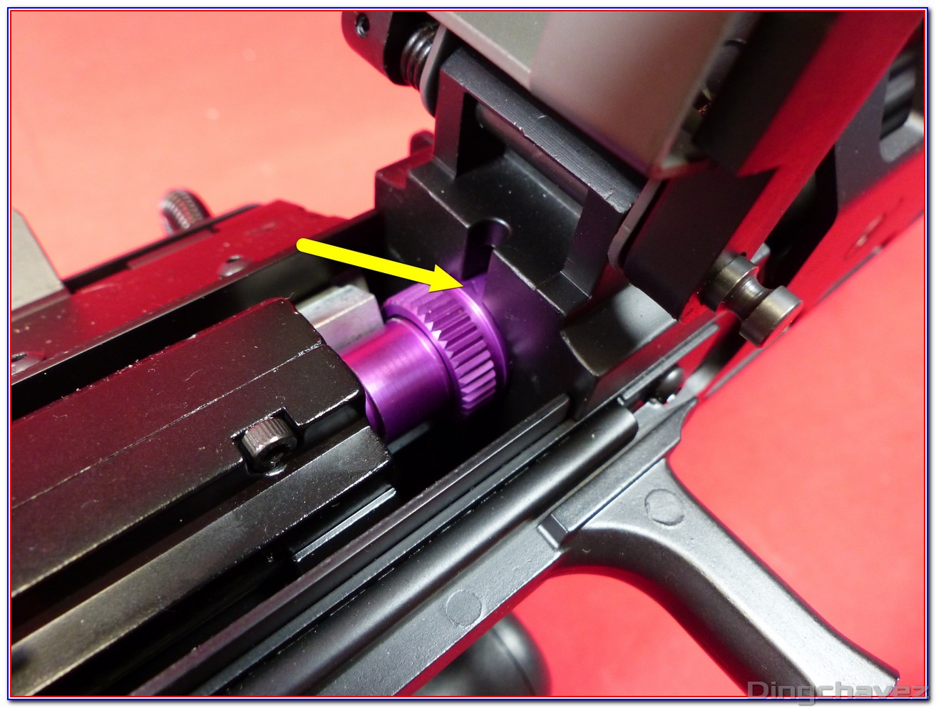 Ci-dessous, le bouton de verrouillage du guide de ressort. Actionnez-le pour expulser le guide et le ressort. ATTENTION, maintenez le guide pour éviter qu’il s’envole !