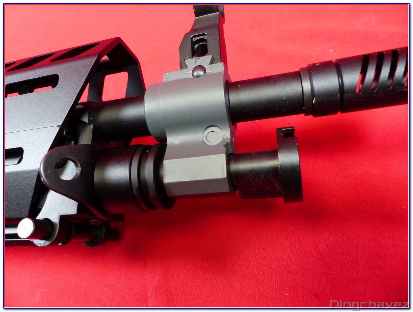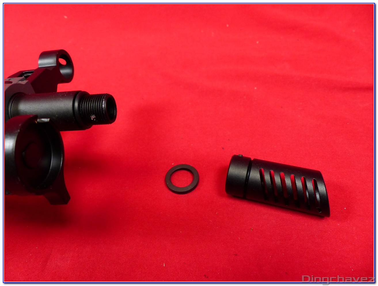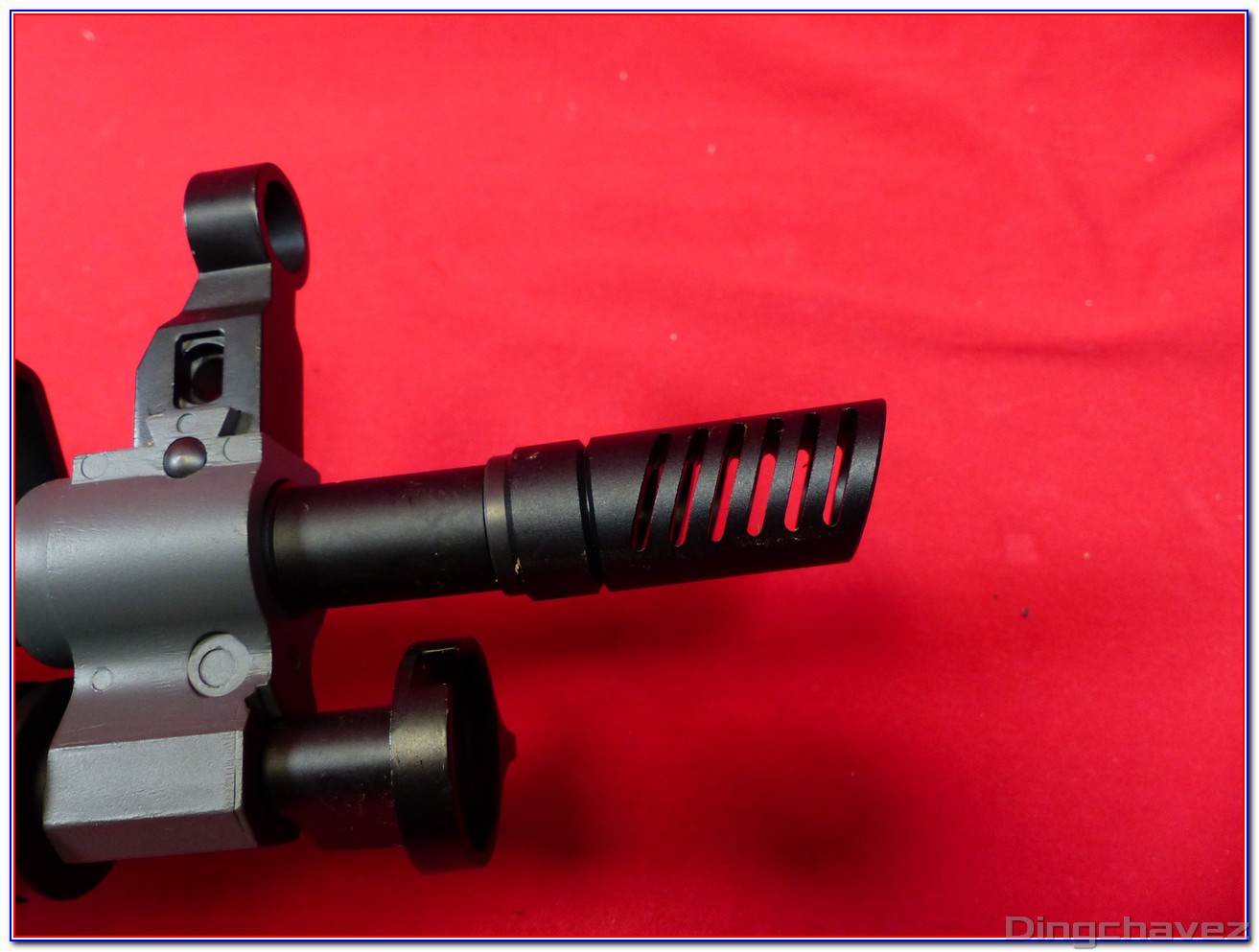 Le canon externe se termine par un compensateur en alliage très léger monté sur un filetage au pas de 14mm antihoraire (CCW). ATTENTION : une petite vis d’arrêt (grub screw) le maintient en place.