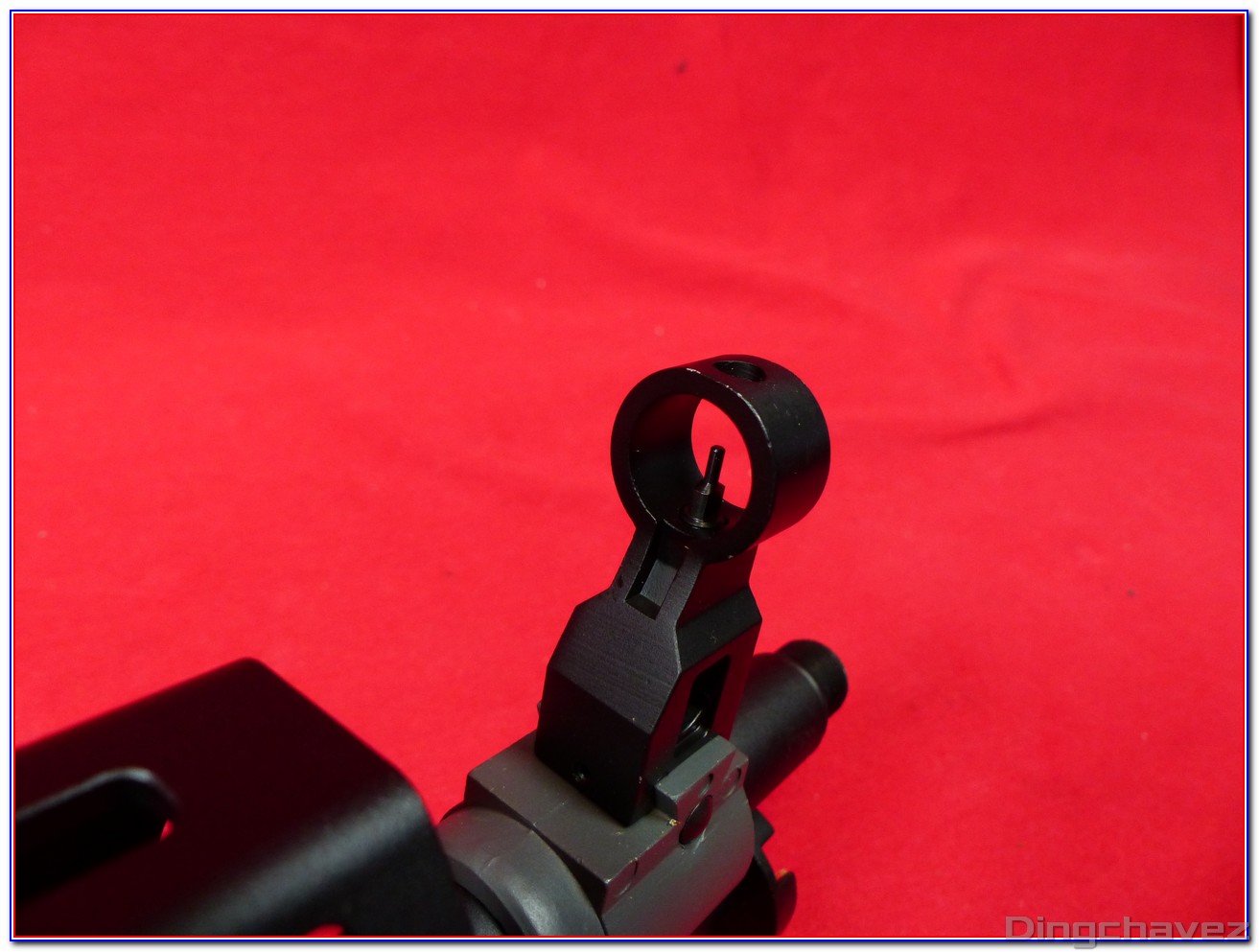 Le guidon est constitué d’un bloc comportant un anneau et un cran ajustable en hauteur. Le bloc étant monté sur queue d’aronde, il est peut-être possible d’ajuster la dérive également, je n’ai pas testé.