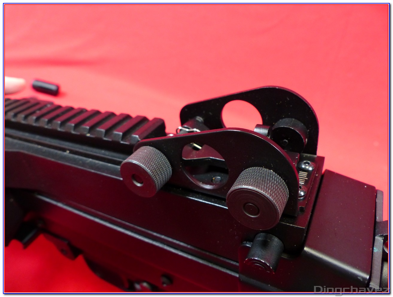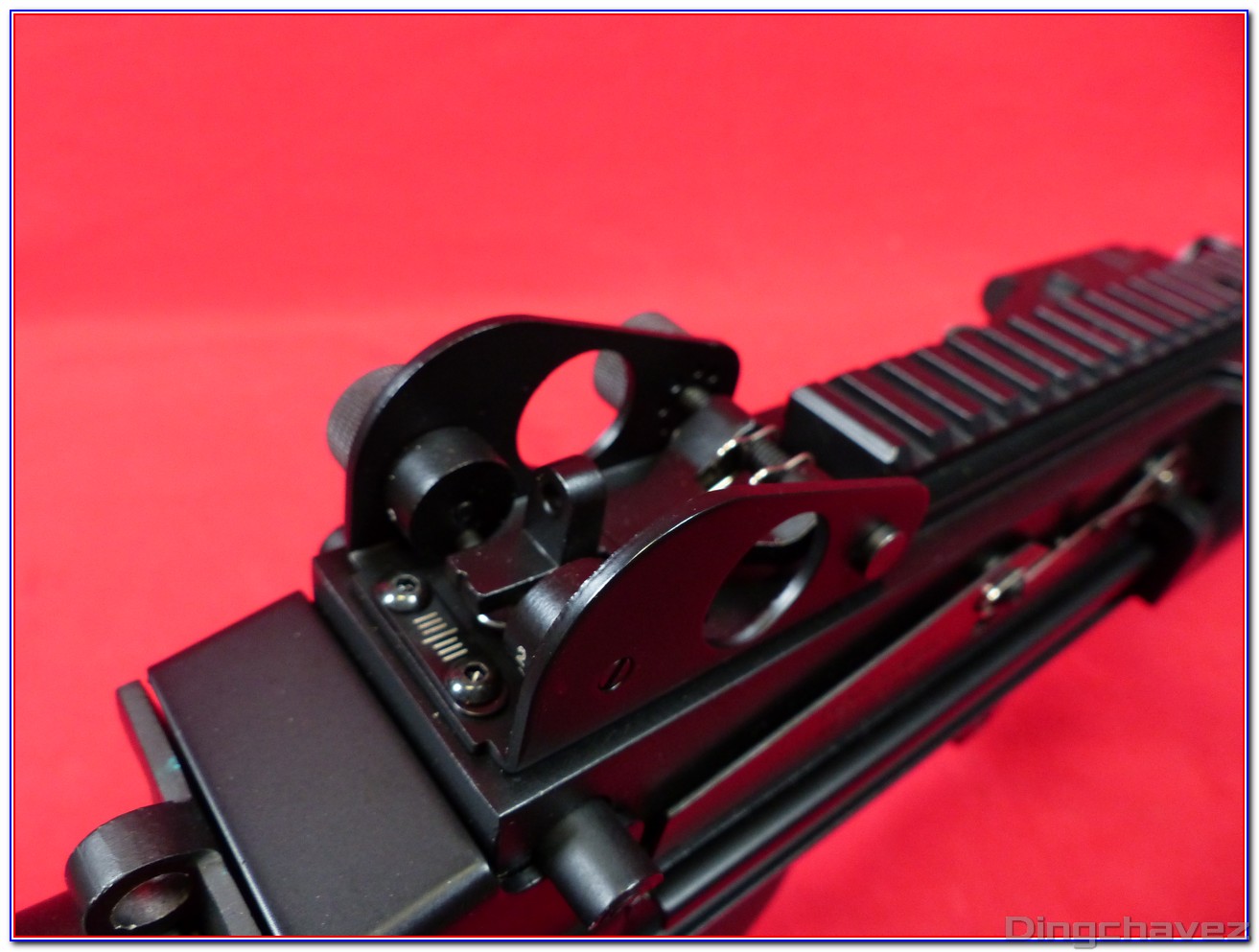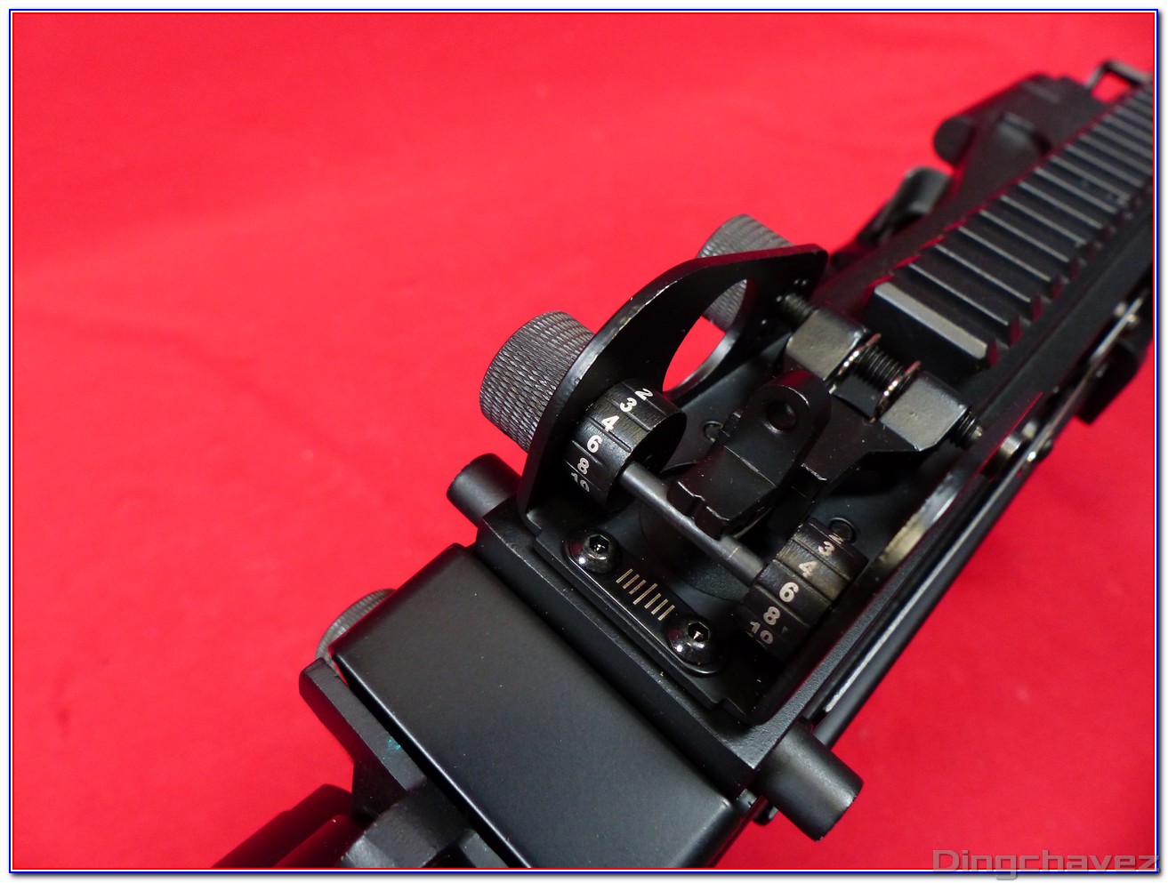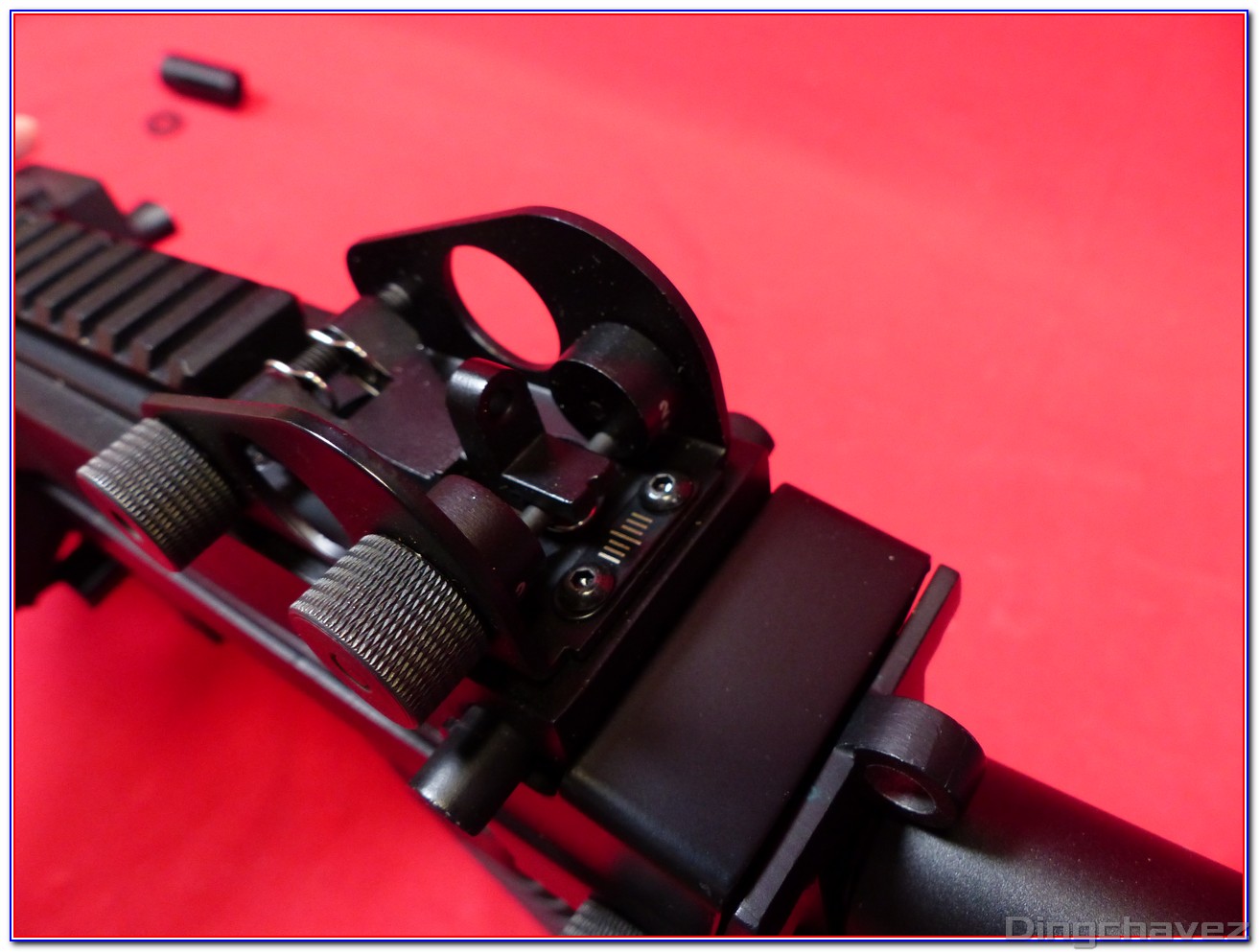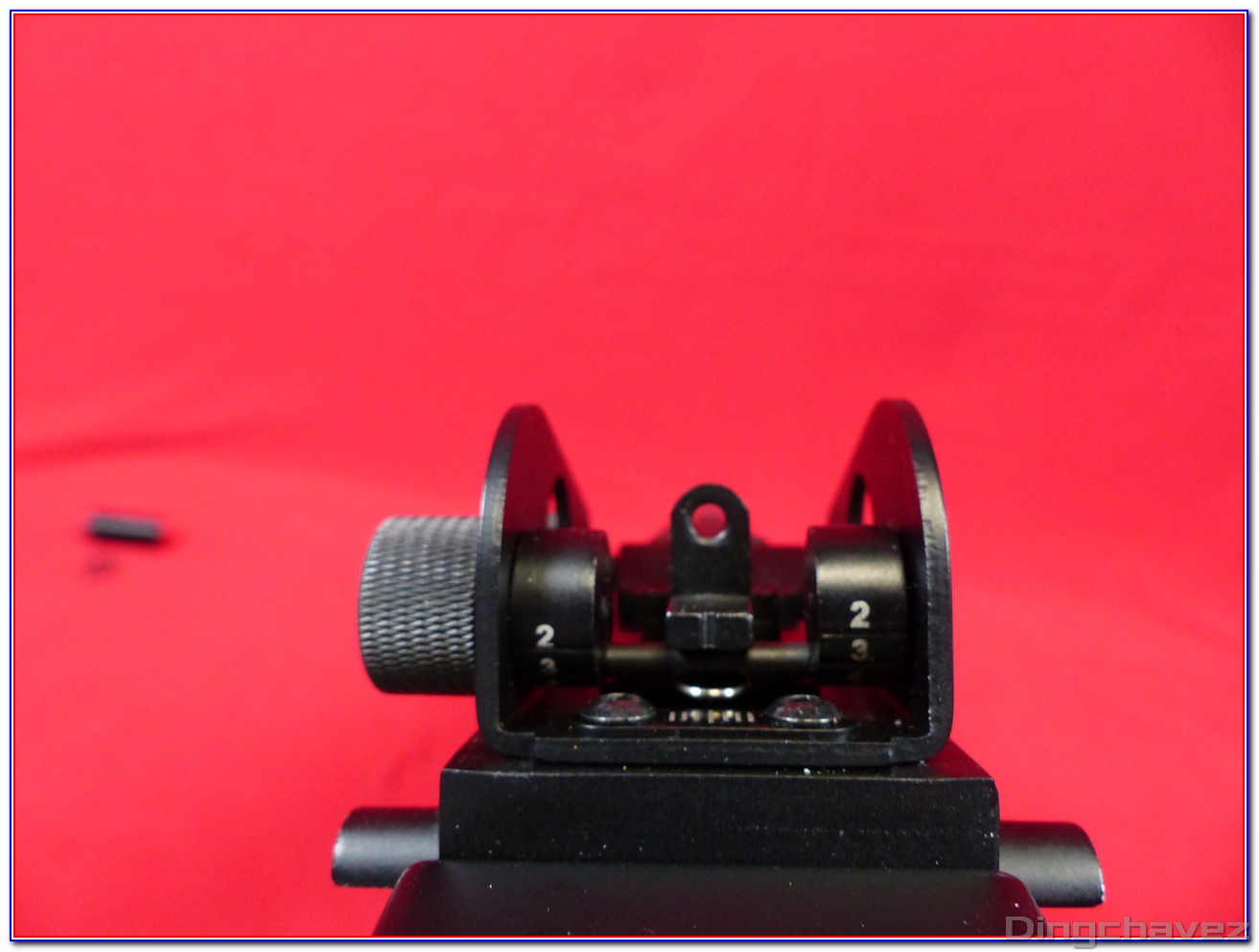 La hausse est ajustable en hauteur et en dérive. Des graduations sont présentes à l’arrière.