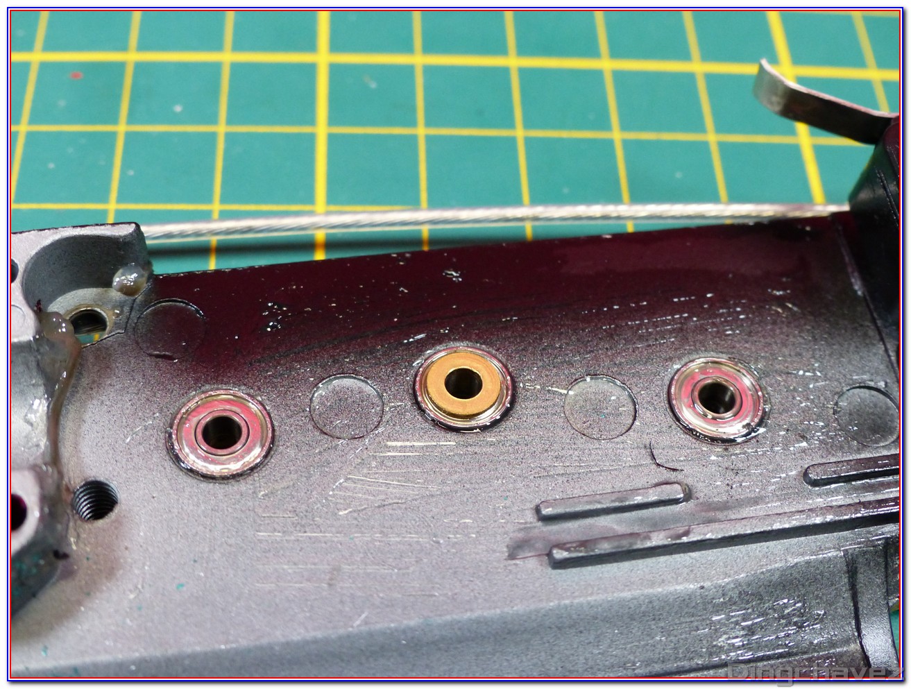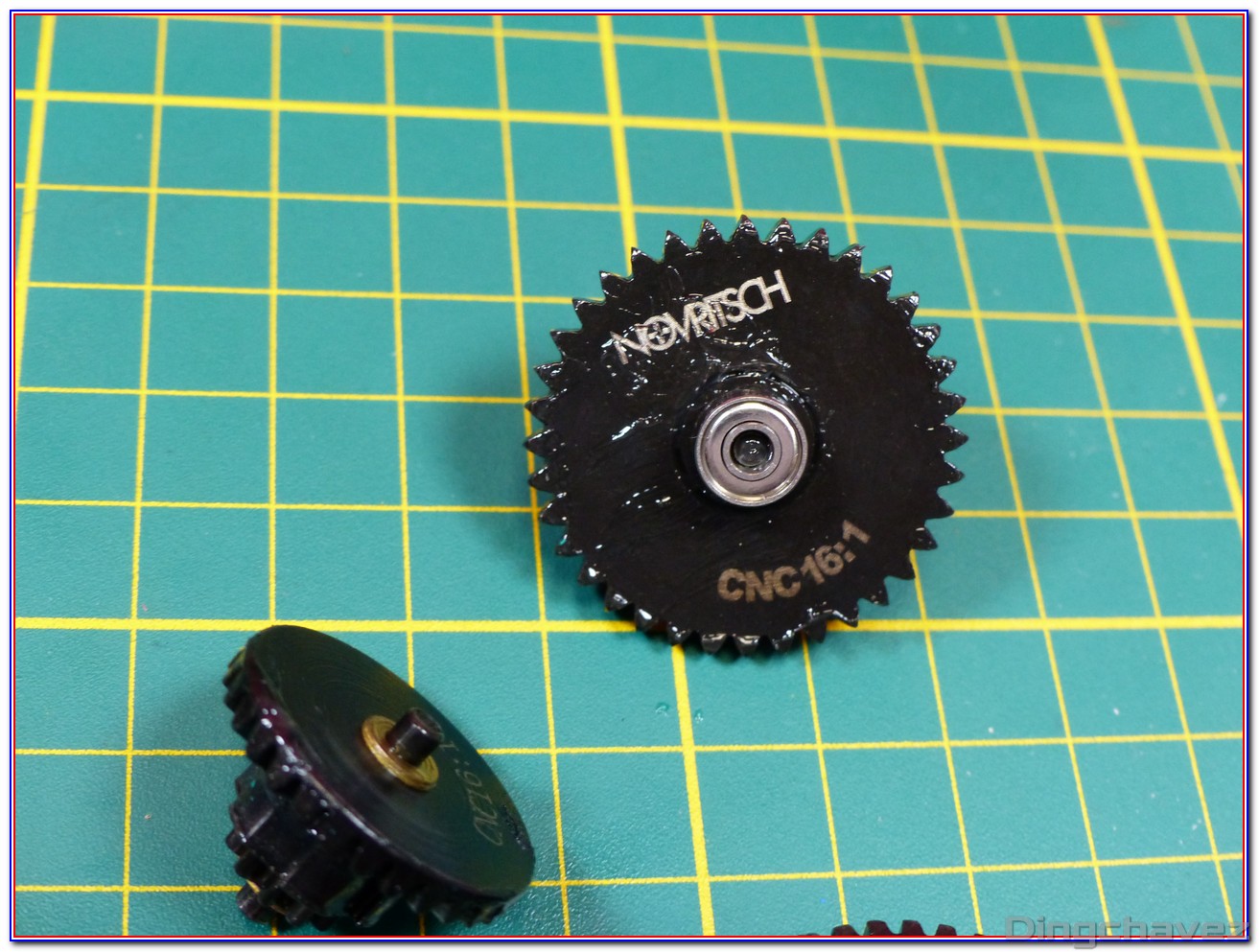 Les engrenages prennent place sur des roulements de 8mm. Le calage d’origine était plutôt bon. J’ai simplement ajouté une rondelle (shim) sur le sector gear.