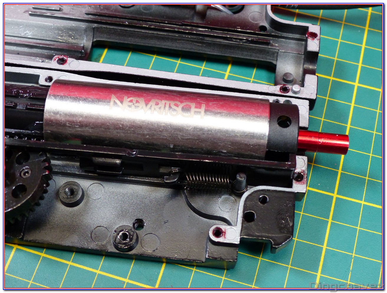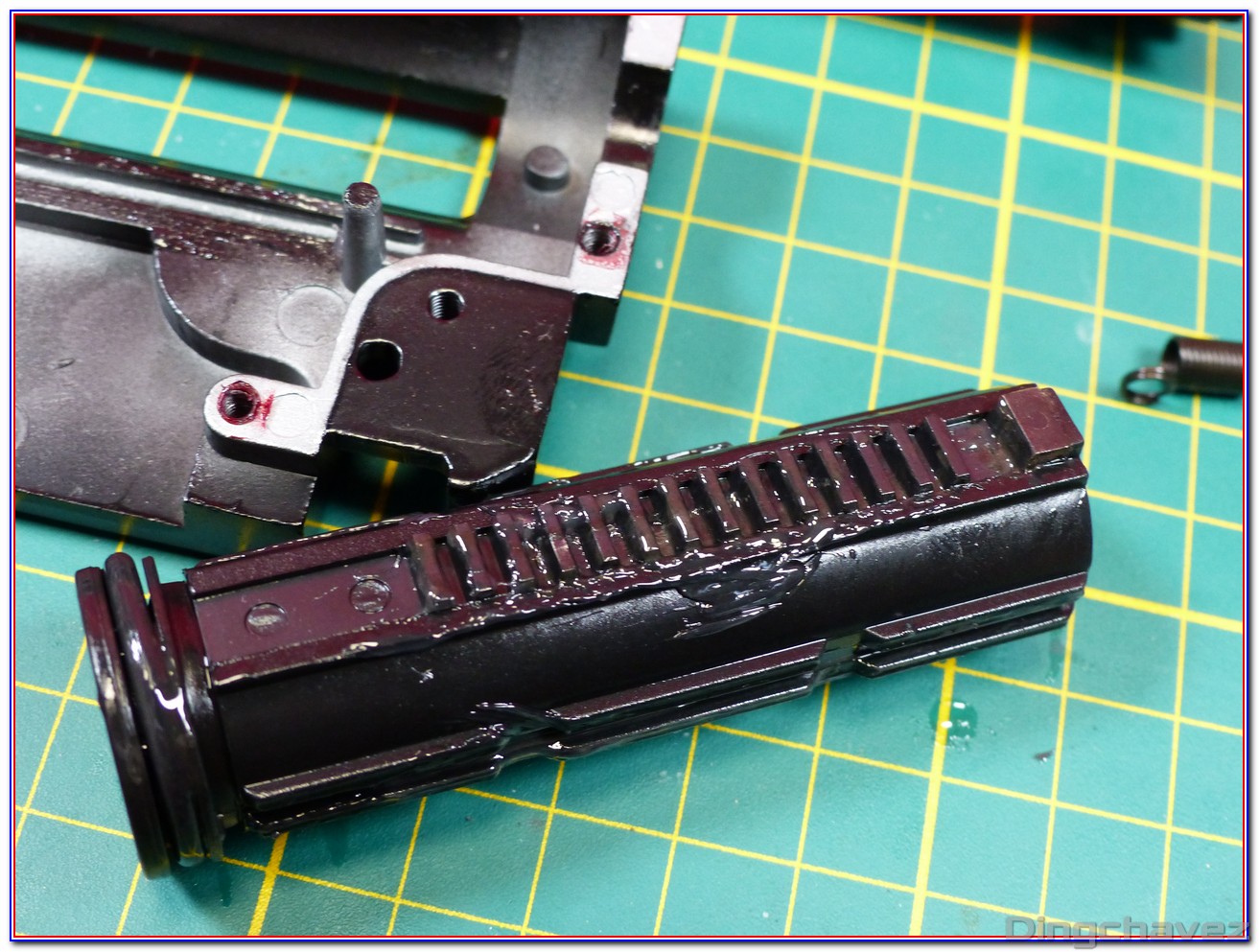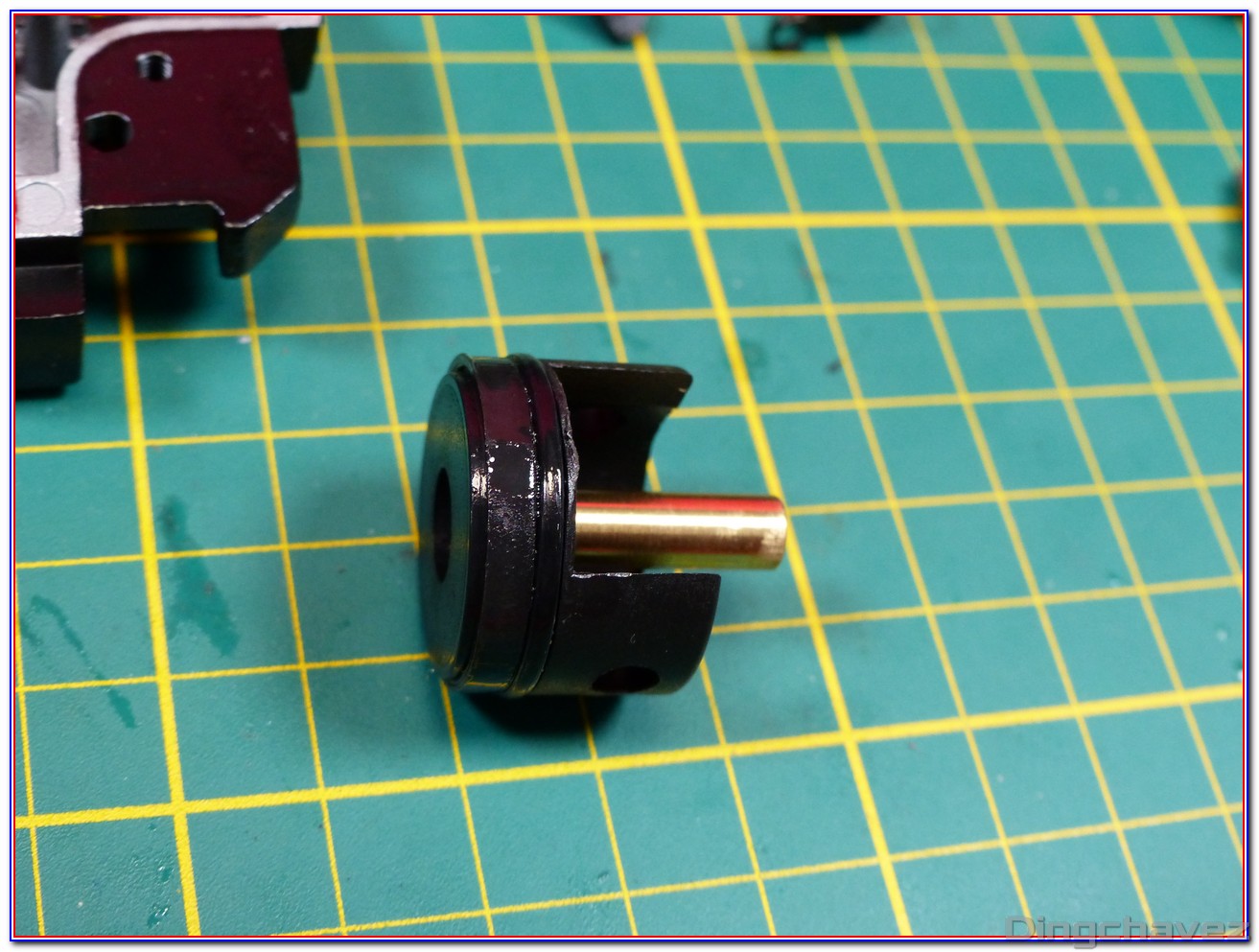 La partie pneumatique de mon exemplaire était parfaitement étanche. Le piston en polymère est équipé d’une crémaillère en acier de 14 dents. La tête de piston est également en polymère, elle est vissée par l’avant et est ventilée.