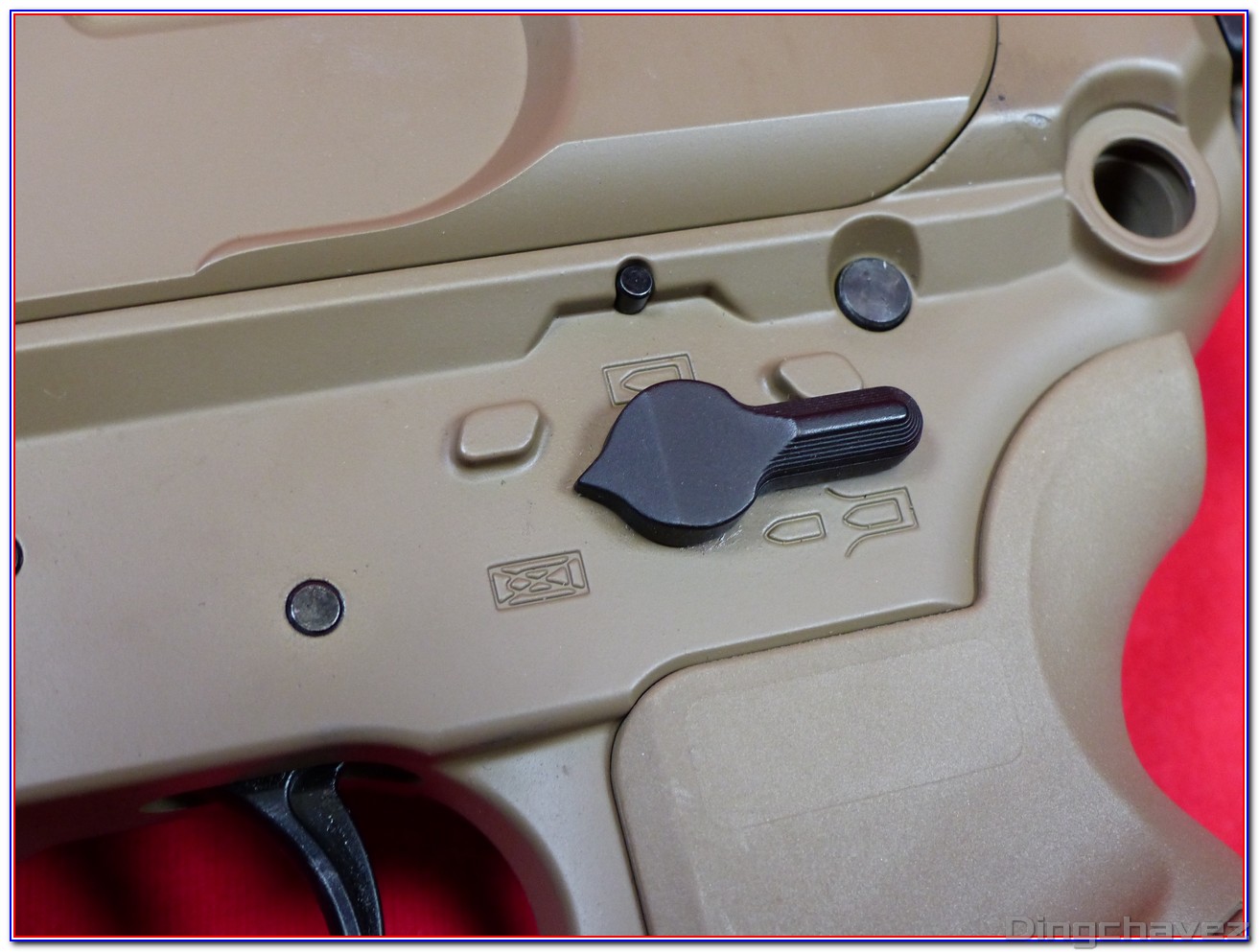 Le sélecteur de tir ambidextre à trois positions. SAFE, SEMI et AUTO. Chaque position est repérée par un pictogramme.