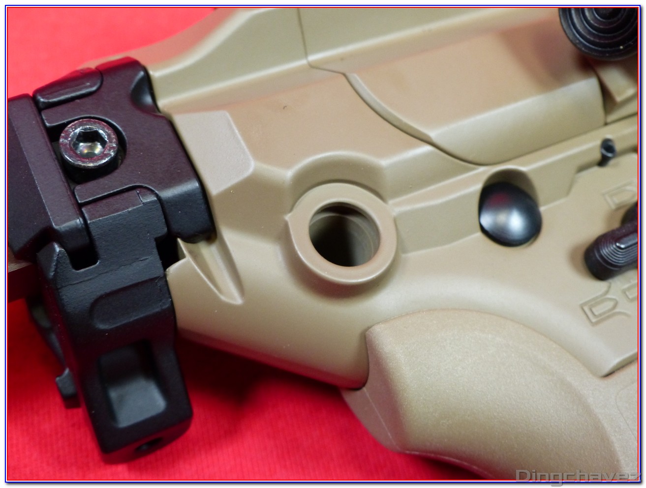 L’ajustement du hop-up s’effectue via une molette située à l’avant du upper. Il n’y a pas besoin de tout démonter, on peut simplement bloquer le BC en arrière et faire tourner la molette à l’aide d’un long outil (ou de ses doigts, si on a de longs doigts…).