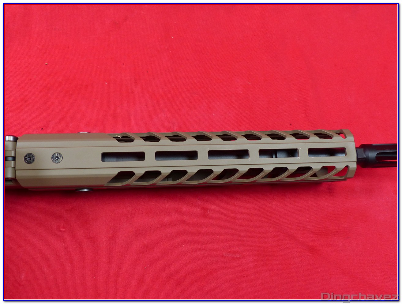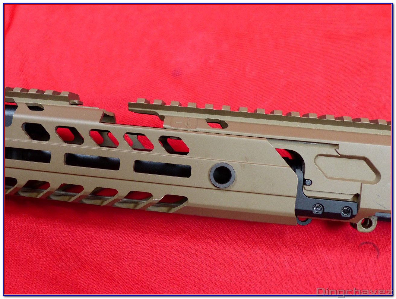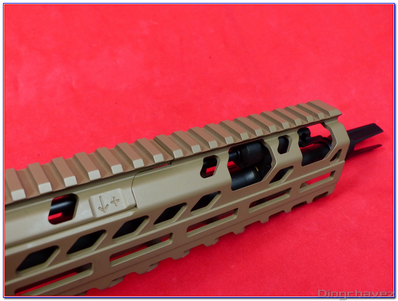 A l’avant, le garde-main dispose de nombreux ports MLOK à 3, 6 et 9 heures et d’une petite portion Picatinny sur le dessus.