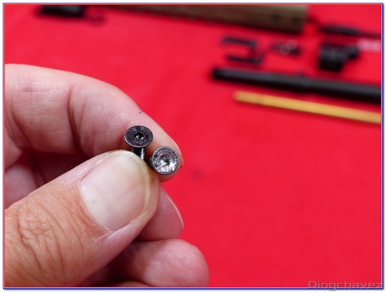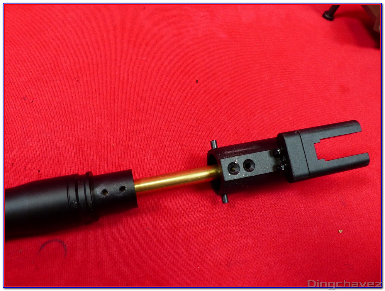Le faux emprunt des gaz est fixé au canon par deux goupilles élastiques et une vis sans tête (grub screw).