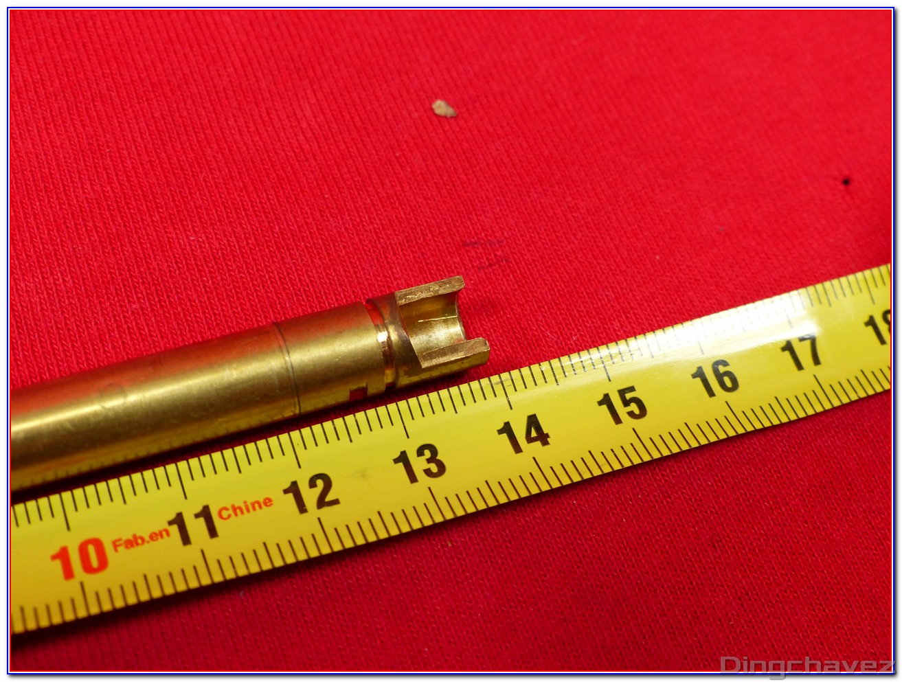 Le canon en laiton mesure 140mm, c’est court mais cela permet de limiter l’énergie en sortie de bouche.