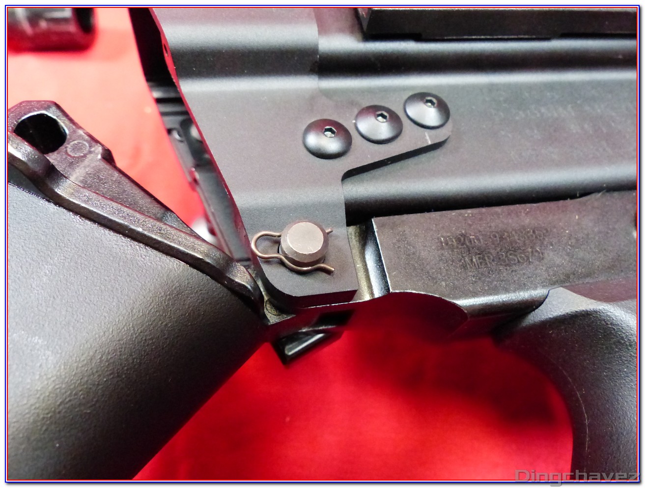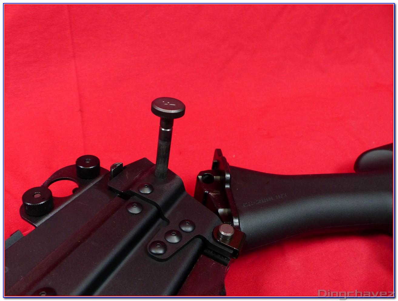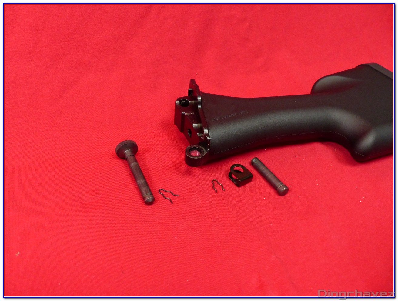 Si vous souhaitez déposer la crosse il faut ôter la goupille du bas. Je ne pense pas que la position de la goupille soit celle de la photo ci-dessous mais c’est comme cela que j’ai reçu la réplique.