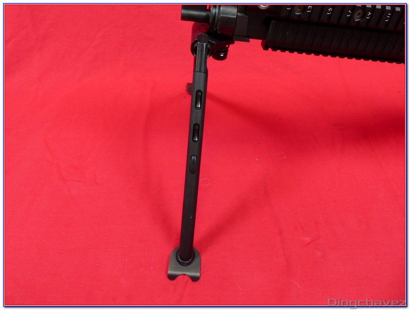 Le bipied est en métal. Il peut être replié vers l’avant ou l’arrière et ses pieds s’ajustent en hauteur.
