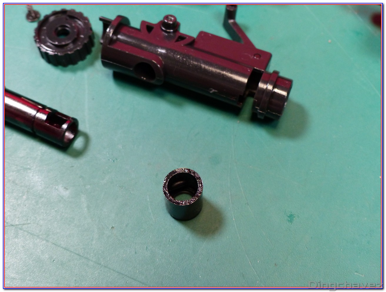 Ici on peut voir une petite partie du canon interne. Un joint torique assure l’étanchéité de l’ensemble. Vous l’avez deviné, il sera difficile de remplacer le canon de cette réplique…